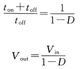 式中,Vout=輸出電壓; toff=關斷時間,Q1; Vin=輸入電壓; ton=導通時間,Q1。 其比率