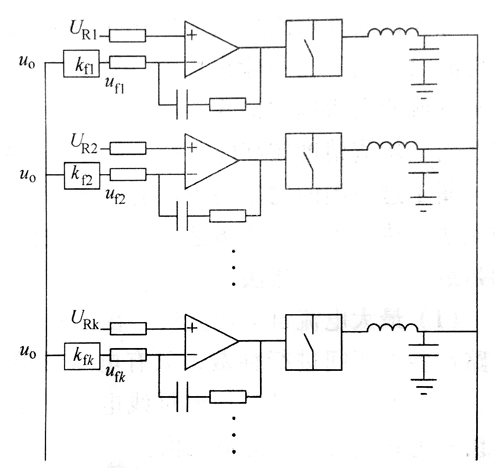 在方式2)和3)中,要求并聯(lián)運行的每個電源適配器平均承擔(dān)負載功率,這并不是簡單地將多個電源適配器的輸出端接在一起就能做到的?幾個結(jié)構(gòu)相同的電源適配器并聯(lián)運行時,輸出端連接在一起,輸出電壓被強制相等,但由于各自參數(shù)的分散性使得每個5伏電源適配器的戴維南等效電壓和電阻均會存在差異,而通常開關(guān)電源適配器的戴維南等效電阻都非常小,因此輸出電壓很小的差異就會導(dǎo)致各電源適配器的輸出電流出現(xiàn)較大的偏差,有的電流較大,有的很小,這種運行狀態(tài)使得電源適配器的壽命衰減不一致,重載的電源適配器會提前損壞,達不到提高可靠性的目的,因此應(yīng)盡量使各電源適配器的輸出電流分配均衡?為了能使各電源適配器均分負載電流,首先需要深入分析電源適配器電流分配不均的機理,然后采取相應(yīng)對策? 多個電源適配器并聯(lián)后的情況見圖? 所有120w電源適配器輸出連接在一起,因此它們的輸出電壓a?都是相同的,但每個電源適配器的給定量Un?反饋比例系數(shù)ka略有差異,再考慮到運放的失調(diào)電壓也不盡相同,因此各電源適配器誤差信號c=Um-k?也各不相同(本小節(jié)中下角標(biāo)k均表示第k個電源適配器)?各電源適配器的電壓調(diào)節(jié)器通常都采用比例一積分(P)調(diào)節(jié)器? 當(dāng)各電源適配器的輸出剛并聯(lián)到一起時,有的電源適配器誤差信號c為正,電壓調(diào)節(jié)器正向積分,輸出電流增加:有的電源適配器c為負,電壓調(diào)節(jié)器反向積分,輸出電流變小?