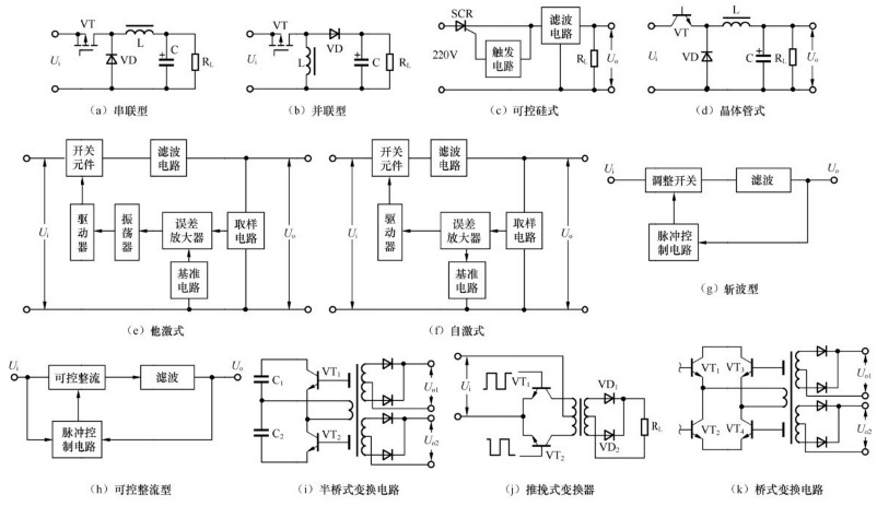 | 現(xiàn)在,電子技術(shù)及其應(yīng)用,對(duì)電子儀器和設(shè)備的要求是:在性能上更加安全可靠,在功能上不斷地增強(qiáng),在使用上自動(dòng)化程度越來越高,在體積上要日趨小型化。這使采用具有眾多優(yōu)點(diǎn)的開關(guān)穩(wěn)壓電源適配器就顯得更加重要了。所以,90W電源適配器在計(jì)算機(jī)、通信、航天、家電等方面都得到了越來越廣泛的應(yīng)用,發(fā)揮了巨大的作用,這大大促進(jìn)了開關(guān)穩(wěn)壓電源適配器的發(fā)展,從事這方面研究和生產(chǎn)的人員也在不斷地增加,開關(guān)穩(wěn)壓電源適配器的品種和類型也越來越多。圖給出了各種類型開關(guān)穩(wěn)壓電源適配器的原理圖。目前開關(guān)穩(wěn)壓電源適配器的拓?fù)浣Y(jié)構(gòu)可分為以下幾類。 (1)按激勵(lì)方式分類 ①他激式開關(guān)穩(wěn)壓電源適配器。電路中設(shè)有激勵(lì)信號(hào)的振蕩器,電路形式如圖所示。 ②自激式開關(guān)穩(wěn)壓電源適配器。開關(guān)管兼作振蕩器中的振蕩管,電路形式如圖所示。 (2)按調(diào)制方式分類 ①脈寬調(diào)制型開關(guān)穩(wěn)壓電源適配器。振蕩頻率保持不變,通過改變脈沖寬度來改變和調(diào)節(jié)輸出電壓的大小,有時(shí)通過取樣電路、耦合電路等構(gòu)成反饋閉環(huán)回路來穩(wěn)定輸出電壓的幅度。 ②頻率調(diào)制型開關(guān)穩(wěn)壓電源適配器。占空比保持不變,通過改變振蕩器的振蕩頻率來調(diào)節(jié)和穩(wěn)定輸出電壓的幅度。 ③混合調(diào)制型開關(guān)穩(wěn)壓電源適配器。通過調(diào)節(jié)導(dǎo)通時(shí)間的振蕩頻率來完成調(diào)節(jié)和穩(wěn)定輸出電壓的幅度。 (3)按開關(guān)管電流的工作方式分類 ①開關(guān)型開關(guān)穩(wěn)壓電源適配器。用開關(guān)管把直流電變成高頻標(biāo)準(zhǔn)方波,電路形式類似于他激式。 ②諧振型開關(guān)穩(wěn)壓電源適配器。開關(guān)管與LC諧振回路將直流電變成準(zhǔn)正弦波,電路形式類似于自激式。 (4)空氣凈化器充電器按開關(guān)管的類型分類 ①晶體管型開關(guān)穩(wěn)壓電源適配器。采用晶體管作為開關(guān)管,電路形式如圖所示。 ②可控硅型開關(guān)穩(wěn)壓電源適配器。采用可控硅作為開關(guān)管,這種電路的特點(diǎn)是直接輸入交流電,不需要一次整流部分,其電路形式如圖所示。 (5)按儲(chǔ)能電感與負(fù)載的連接方式分類 ①串聯(lián)型開關(guān)穩(wěn)壓電源適配器。儲(chǔ)能電感串聯(lián)在輸入與輸出電壓之間,電路形式如圖所示。 ②并聯(lián)型開關(guān)穩(wěn)壓電源適配器。儲(chǔ)能電感并聯(lián)在輸入與輸出電壓之間,電路形式如圖所示。 (6)按開關(guān)管的連接方式分類 ①單端式開關(guān)穩(wěn)壓電源適配器。電路中僅使用一個(gè)開關(guān)管,這種電路的特點(diǎn)是價(jià)格低,結(jié)構(gòu)簡(jiǎn)單,但輸出功率不高,其電路形式如圖(a)、(b)和(d)所示。 ![]() ②推挽式開關(guān)穩(wěn)壓電源適配器。電路中使用兩個(gè)開關(guān)管,將其連接成推挽功率放大器形式。這種電路的特點(diǎn)是開關(guān)變壓器必須具有中心抽頭,電路形式如圖(j)所示。 ③半橋式開關(guān)穩(wěn)壓電源適配器。電路中使用兩個(gè)開關(guān)管,將其連接成半橋形式。它的特點(diǎn)是適應(yīng)于輸入電壓較高的場(chǎng)合,電路形式如圖(i)所示。 ④全橋式開關(guān)穩(wěn)壓電源適配器。電路中使用4個(gè)開關(guān)管,將其連接成全橋形式。它的特點(diǎn)是輸出的功率比較大,其電路形式如圖(k)所示。 (7)按輸入與輸出電壓的大小分類 ①升壓式開關(guān)穩(wěn)壓電源適配器。輸出電壓比輸入電壓高,實(shí)際上就是并聯(lián)型開關(guān)穩(wěn)壓電源適配器。 ②降壓式開關(guān)穩(wěn)壓電源適配器。輸出電壓比輸入電壓低,實(shí)際上就是串聯(lián)型開關(guān)穩(wěn)壓電源適配器。 (8)按工作方式分類 ①可控整流型開關(guān)穩(wěn)壓電源適配器。所謂可控整流型開關(guān)穩(wěn)壓電源適配器,是指采用可控硅整流元件作為調(diào)整開關(guān)管,可由交流市電電網(wǎng)直接供電,也可用變壓器變壓后供電(這種供電方式在開關(guān)穩(wěn)壓電源適配器剛興起的初期常常采用,目前基本上不太采用)。在可工作的半波內(nèi),截去正弦曲線的前一部分,這一部分所占角度稱為截止角,導(dǎo)通的正弦曲線的后一部分稱為導(dǎo)通角。這種類型的開關(guān)電源適配器依靠調(diào)節(jié)導(dǎo)通角的大小,可達(dá)到調(diào)整輸出電壓和穩(wěn)定電壓的目的,其電路如圖圖(h)所示。 ②斬波型開關(guān)穩(wěn)壓電源適配器。斬波型開關(guān)穩(wěn)壓電源適配器是指采用直流供電,直流輸入電壓加到開關(guān)電路上,在開關(guān)電路的輸出端得到單向的脈動(dòng)直流電,經(jīng)過濾波得到與輸入電壓不同的穩(wěn)定的直流電壓。電路還從輸出電壓取樣,經(jīng)過比較、放大,控制脈沖發(fā)生電路產(chǎn)生的脈沖信號(hào),用以控制調(diào)整開關(guān)的導(dǎo)通時(shí)間和截止時(shí)間的長(zhǎng)短或開關(guān)的工作頻率,較后達(dá)到穩(wěn)定輸出電壓的目的。過壓保護(hù)電路也是依據(jù)這一部分提供的取樣信號(hào)來進(jìn)行工作的,斬波型電路的形式如圖(g)
