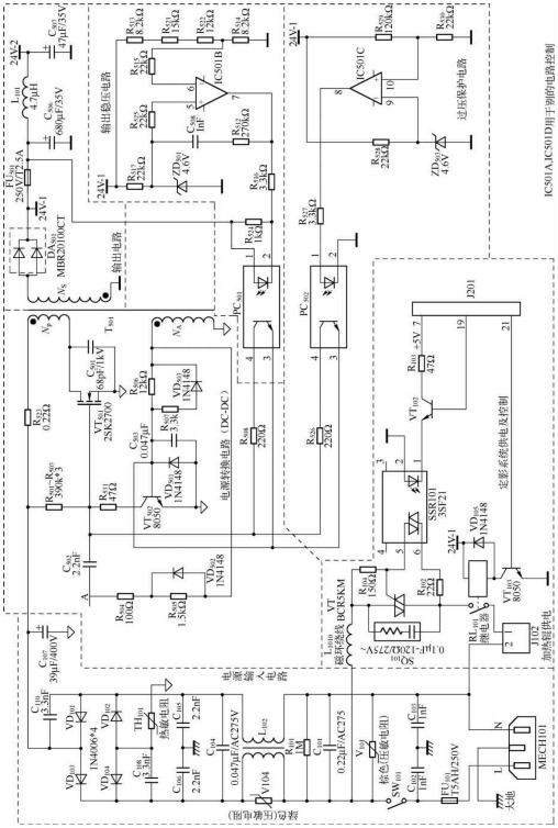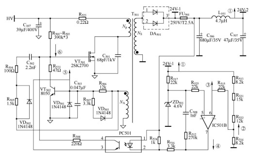 目前許多打印機使用自激式電源適配器,根據功能和打印方式的不同,打印機可分為針式打印機、票據打印機、噴墨打印機、激光打印機等多種。圖3-33為惠普HP1018激光打印機電源適配器原理圖,主要由市電交流輸入及轉換、定影系統供電、主電源適配器等電路構成。各部分電路工作原理如下。![]() 1.市電輸入及轉換 電源適配器輸入電路是指高頻干擾抑制、整流和濾波電路。其作用是把電網的工頻交流電轉換為平滑的直流電,給電源適配器提供輸入電壓,并抑制和濾除輸入端的高頻雙向干擾。有關輸入電路各元器件的作用可參見第2章中的表2-3。 2.定影系統供電及控制 通電后,打印機CPU經由接插件J201的19、21腳送入高電平,因J201的7腳為+5V(來自于主控板),VT102與VT103均導通。其中,VT102導通,經光耦SSR101(3SF21)給雙向可控硅VT101(BCR5KM)提供觸發信號使其導通;VT103導通,繼電器RL101觸點吸合,此時市電通過接插件J101為陶瓷片供電加熱。當加熱陶瓷片的溫度達到185℃左右時,接插件J201的19腳變為低電平,VT102截止,VT101關斷,陶瓷片加熱停止,與此同時,微處理器發出指令使“準備好”燈點亮。 另外,該機具有節能功能。如果在設定時間內打印機仍未工作,則接插件J201的21腳變為低電平,VT103截止,繼電器RL101觸點釋放,機器進入待機狀態。二極管VD105反并聯于繼電器RL101供電線圈兩端,在VT103截止時吸收線圈瞬間感應電壓,對VT103起保護作用。 雙向可控硅VT101主回路兩端并聯的SQ101是一個阻容串聯復合體,復合體電阻為120Ω,電容為0.1μF/AC275V。在可控硅關斷瞬間,阻容復合體吸收感性負載的瞬變高壓(也可以理解為“剩余能量”)保護可控硅。這種阻容復合體吸收電路在交流市電的可控硅供電系統中已經成為必選。 3.主電源 該機是由功率管VT501(2SK2700是MOSFET)和開關變壓器T501為核心構成的自激式電源適配器。 (1)開關管VT501的開關過程 輸入整流濾波電壓約為300V:一路經保險電阻R523(0.22Ω)、T501主繞組NP加到開關管漏極(D);另一路經R501~R503給VT501提供啟動電壓。輔助繞組NA經阻容元件與開關管VT501組成振蕩電路,VT501是開關管兼振蕩管。高壓電容C501(680pF/1kV)并聯在VT501的漏—源極之間,用于抑制VT501關斷瞬間NP產生的浪涌電壓。 VT501導通時,NA同名端(黑圓圈)為正極性電壓:一方面經R504、R505和C502送到功率管柵極加速其導通;另一方面經R506給C503充電,C503兩端電壓約為0.6V時VT502開始導通,并聯于VT502發射結的電容C503兩端正電壓被鉗位。由于C503充電時間常數較大,故在VT501導通一段時間后VT502才導通,降低VT501柵極與源極之間的電壓,VT501漏極電流減小,變壓器所有繞組電壓極性反轉。NA同名端負極性的電壓一路經R504、VD502和C502(VD502旁路R505)加到VT501柵極加速其截止;另一路經R507和VD503給C503放電(R506阻值較大,被R507和VD503旁路),促使VT502退出導通,轉為截止。繼續放電約為-0.6V時VD501開始導通,此時電容C503兩端負電壓被VD501鉗位。 圖為某負載時以A點為參考零電位時測得的功率管柵極(G)電壓波形??梢姡瑬艠O電位(G)始終高于A點電位,振幅約為1.6V。 ![]() 由上述分析可知,VT501柵極通路電容C502充、放電的通路不同,VT502發射結并聯電容C503充、放電的通路也不同,它們均是充電時間常數大、充電慢,放電時間常數小、放電快。C502的充電時間設定了開關管VT501導通的較大脈沖寬度,在此脈寬之內受控于脈寬調制管VT502;其充電慢、放電快有利于VT501快速截止。C503充電慢是為了滿足VT501具有較大導通脈沖寬度,放電快是便于進入下一個控制周期。 (2)穩壓控制 整流管DA501是共陰極(肖特基)二極管,FU501是延時型可恢復保險絲(防止輸出短路)。整流后的脈動電壓經由C506、L101和C507組成的π形濾波器變成紋波很小的直流電。 穩壓電路受光耦PC501和集成運放IC501B控制。R517與ZD501產生4.6V基準電壓,經R525加到IC501B反相端(5腳),輸出電壓經R513、R521、R522(9)和R514串聯產生采樣電壓,經R515加到IC501B同相端(6腳)。由于某種原因導致輸出電壓升高,則IC501B同相端(6腳)電壓升高,輸出端(7腳)電壓隨之降低,光耦PC501光電二極管發光增強(導通電壓約為1V),光電晶體管的等效電阻減小。此時,VT501柵極正脈沖電壓經R508、PC501對C503充電速度加快,VT502提前導通,VT501提前截止,占空比變小,輸出的電壓隨之下降,從而實現穩壓控制。由于某種原因導致當輸出電壓升高,有關節點電壓的變化趨勢如圖3-35所示中的①~⑥,即輸出電壓意外上升后,經一系列反饋,后面導致占空比減小,從而保持輸出電壓穩定。 ![]() 由上述工作原理分析,則輸出電壓UO為 ![]() 式中,4.6V為穩壓二極管ZD501的參數。代入原理圖中有關元件參數可得 ![]() 電路中,R512與C508串聯后,并聯在IC501B同相輸入端與輸出端之間用作頻率補償。 (3)過壓保護 過壓保護電路主要由IC501C和光電耦合器PC502組成。R528與ZD503組成二極管穩壓電路加到IC501C反相端(9腳),電壓為4.6V;輸出電壓經R529和R530采樣加到IC501C同相端(10腳)。 當集成運放IC501B或光耦PC501出現異常,引起電源適配器輸出電壓接近大約30V[4.6×(1+R529/R530)]時,IC501C的同相端(10腳)接近4.6V,IC501C(8腳)輸出高電平(實測為7.5V),經R527加到光耦PC502的1腳,PC501接替PC501控制VT502,進而影響功率管VT501,穩定30V電壓不再上升。 VT502是脈沖寬度調制管,其較大脈寬受制于C503的充電時間,影響因素正反饋繞組Na、光耦PC501和PC502;C503并聯于VT502的發射結,故C503的慢充、快放模式決定著VT50