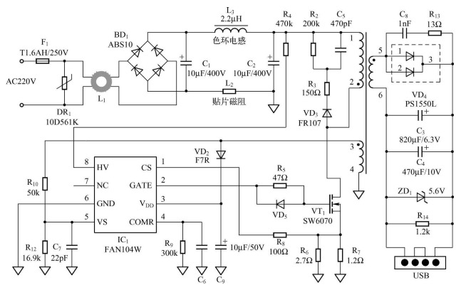 圖為USB手機充電器電路原理圖,采用Fairchild公司出品的一次繞組反饋(PSR(3))控制器FAN104W。