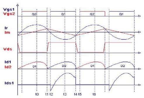 圖中,Vgs1和Vgs2分別是Q1、Q2的驅動波形,Ir為諧振電感Lr電感電流波形,Im為變壓器漏感Lm電流波形,Id1和Id2分別是次級側輸出整流二級管波形,Ids1則為Q1導通電流。
