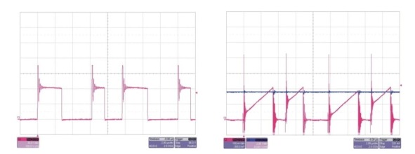 圖 2 兩種常見(jiàn)的電流模式噪聲問(wèn)題 圖 2 顯示了電流斜坡存在的一些問(wèn) 題。第一幅圖顯示了上升邊沿峰值和隨后 產(chǎn)生的電流斜坡。比較器(根據(jù)其不同速度) 具 有 兩 個(gè) 電 壓 結(jié) 點(diǎn) (potential trip points),結(jié)果是無(wú)序控制運(yùn)行,聽(tīng)起來(lái)更 像是煎熏肉的聲音。 利用控制 IC 中的上升邊沿消隱可 以很好地解決這一問(wèn)題,其忽略了電流波 形的較初部分。波形的高頻濾波也有助于 解決該問(wèn)題。同樣也要將電容器盡可能近 地靠近控制 IC 放臵。正如這兩種波形表 現(xiàn)出來(lái)的那樣,另一種常見(jiàn)的問(wèn)題是次諧 波振蕩。這種寬-窄驅(qū)動(dòng)波形表現(xiàn)為非充 分斜率補(bǔ)償。向當(dāng)前斜坡增加更多的電壓 斜坡便可以解決該問(wèn)題。盡管您已經(jīng)相當(dāng) 仔細(xì)地設(shè)計(jì)了電源布局,但是您的原型電 源還是存在噪聲。這該怎么辦呢?首先, 您要確定消除不穩(wěn)定因素的環(huán)路響應(yīng)不 存在問(wèn)題。有趣的是,噪聲問(wèn)題可能會(huì)看 起來(lái)像是電源交叉頻率上的不穩(wěn)定。但真 正的情況是該環(huán)路正以其較快響應(yīng)速度 糾出注入誤差。同樣,較佳方法是識(shí)別出噪聲正被注入下列三個(gè)地方之一:誤差放 大器、參考電壓或斜坡。您只需分步解決 便可!第一步是檢查節(jié)點(diǎn),看斜坡中是否 存在明顯的非線性,或者誤差放大器輸出 中是否存在高頻率變化。如果檢查后沒(méi)有 發(fā)現(xiàn)任何問(wèn)題,那么就將誤差放大器從電 路中取出,并用一個(gè)清潔的電壓源加以代 替。這樣您應(yīng)該就能夠改變?cè)撾妷涸吹妮?出,以平穩(wěn)地改變電源輸出。如果這樣做 奏效的話,那么您就已經(jīng)將問(wèn)題范圍縮小 至參考電壓和誤差放大器了。 有時(shí),控制 IC 中的參考電壓易受開(kāi) 關(guān)波形的影響。利用添加更多(或適當(dāng))的 旁路可能會(huì)使這種狀況得到改善。另外, 使用柵極驅(qū)動(dòng)電阻來(lái)減緩開(kāi)關(guān)波形也可 能會(huì)有助于解決這一問(wèn)題。如果問(wèn)題出在 誤差放大器上,那么降低補(bǔ)償組件阻抗會(huì) 有所幫助,因?yàn)檫@樣降低了注入信號(hào)的振 幅。如果所有這些方法都不奏效,那么就 從印刷電路板將誤差放大器節(jié)點(diǎn)去除。對(duì) 補(bǔ)償組件進(jìn)行架空布線 (air wiring) 可 以幫助我們識(shí)別出哪里有問(wèn)題。