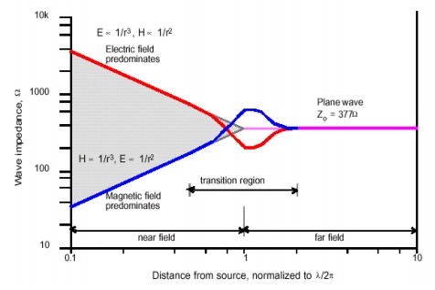 在遠場區(qū)電場和磁場方向垂直并且都和傳播方向垂直稱為平面波,電場和磁場的比值為固定值,為 Zo=120∏=377 歐。下圖為波阻抗與距離的關(guān)系。
