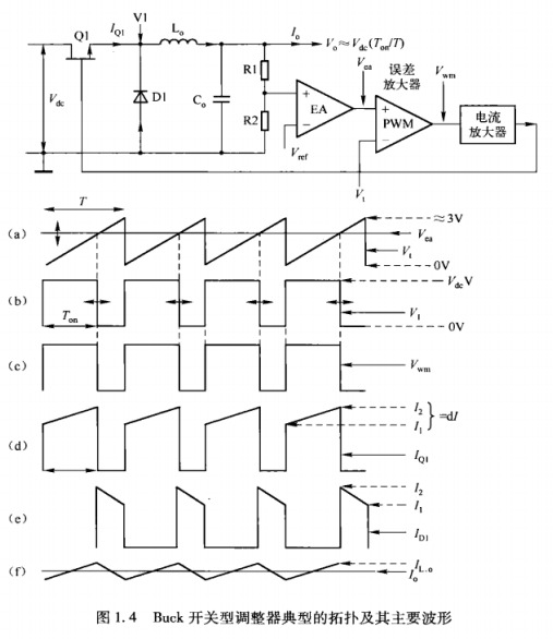 Buck開關型調整器 串接晶體管的高功耗和笨重的工頻變壓器使得線性調整器在現代電子應用中失去了重要地位。而且,高功耗串接元件需要的大散熱片和大體積儲能電容增大了線性調整器的體積。隨著電子技術的發展,電路的集成化使得電路系統的體積更小。一般的線性調整器輸出負載的功率密度僅為0.2~0.3W/in3,不能滿足電路系統小型化的要求。而且,線性電源適配器不能夠提供數字存儲系統所需要的足夠長的保持時間。 取代線性調整器的開關型調整器早在20世紀60年代就開始應用。一般的,這些新的15W電源適配器使用開關晶體管將輸入直流電壓斬波成方波。方波由占空比調節,并通過低通輸出功率濾波得到直流輸出電壓。 濾波器一般采用電感和輸出電容。通過調節占空比,可以控制經過輸出電容濾波的電壓平均值。方波脈沖經過低通濾波器濾波后得到的直流輸出電壓等于方波脈沖的平均值Buck開關型調整器典型的拓撲及其波形如圖所示。 使用合適的LC濾波器可將方波脈沖平滑成無紋波直流輸出,其值等于方波脈沖的平均值。整個電路采用輸出負反饋,通過檢測輸出電壓并結合負反饋控制占空比,穩定輸出電壓不受輸入網壓和負載變化的影響。 目前高頻開關電源適配器的功率密度可達20W/in3,而且可以獲得與輸入隔離的多組輸出。它們無需工頻變壓器,效率達到75%~95%。有些DC/DC變換器功率密度可高達50w/in3 Buck調整器的基本符號和波形 補充: 電源適配器廠家介紹了以下開關型調整器的恒頻工作方式,在這類調整器中,功率器件的導通時間(Ton)是可調的,而整個開關周期(T)是固定的,即開關頻率(1/T)也是固定的。 比例Ton/T一般稱為占空比。在某些書中,占空比用Ton/(Ton+Toff)表示,其中Toff是功率器件的關斷時間,因此Ton+Toff=T。 除了恒頻工作方式,還有導通時間固定而頻率可調的工作方式,或者導通時間和頻率均可調的工作方式。 dl、di、dV、dv、dT和dt的用法不是很嚴格,一般用來表示△l、△V和△的變化量。例如,△∥△t用導數d/dt表述,表示電流相對時間的變化量或波形的斜率。 12w電源適配器Buck調整器的基本工作方式 Buck調整器的基本電路如圖1。4所示。晶體管Q1與直流輸入電壓V串聯,通過Q1硬開通和硬關斷,在V1處產生方波電壓。采用恒頻控制方式,占空比可調,Q1導通時間為T。Q1導通時,V1點電壓為V(設Q1導通,壓降為零),電流通過串接電感L流入輸出端。Q1關斷時,電感L產生反電動勢,使V1點電壓迅速下降到零,并變負值直至被二極管D1(也稱續流二極管)鉗位于-0.8V。 設此刻二極管D壓降也為零,則V點電壓波形為矩形波,如圖所示,T時段電壓為V,其余時段電壓為零。該方波的電壓平均值為V7/7。LC濾波器接于Ⅵ和V之間,它使輸出點V成為幅值等于V7。/7的無尖峰無紋波的直流電壓。 采樣電阻R和R2檢測輸出電壓V,并將其輸入誤差放大器(EA)與參考電壓V進行比較。被放大的誤差電壓V被輸入到脈寬調制器(電壓比較器)PWM。PWM比較器的另一個輸入是周期為T的鋸齒波,如圖所示,其幅值一般為3V。PWM電壓比較器產生矩形波脈沖,即圖(c)中的V=,它從鋸齒波起點開始到鋸齒波與誤差放大器輸出電壓交點結束。因此,PwM輸出的脈沖寬度T=與誤差放大器輸出電壓成比例。 PWM脈沖輸入到電流放大器并以負反饋方式控制開關管Q1的通斷。其邏輯關系是:若輸入電壓V稍升高,則EA輸出電壓V將降低使鋸齒波與V交點提前,Q1導通時間T。縮短使輸出電壓V0=VdcTon/T保持不變。同理,若V下降,則導通時間7正比的延長使保持不變。Q1導通時間的改變使采樣電壓總是等于參考電壓,即V0R2/(R2+R1)=Vref。 ![]()