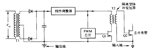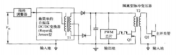 | 圖是三種實(shí)用的輔助電源適配器的簡(jiǎn)化電路,其誤差放大器和脈寬調(diào)節(jié)器都置于PWM芯片內(nèi),PWM芯片接輸出地。 交流輸入的輔助電源適配器 圖所示是較簡(jiǎn)單較常用的交流輸入軸助電源適配器電路。其中,工頻變壓器(通常為2~6W)由交流電網(wǎng)直接供電,其次級(jí)經(jīng)整流后接輸出地。很多廠家都可提供此類變壓器,其初級(jí)繞組也有抽頭,可滿足不同網(wǎng)壓輸入(15V20V、50Hz/60Hz)的要求。 ![]() 作為網(wǎng)壓供電的變換器,較簡(jiǎn)單的輔助電源適配器就是一個(gè)小功率(2W)、60H的隔離變壓器,其次級(jí)帶整流器,產(chǎn)生以輸出地為參考的15V直流電壓。該變壓器串聯(lián)一個(gè)與輸出共地的輸出電壓為12V的線性調(diào)節(jié)器。 6VA電源適配器的典型尺寸為1.88n×1.56in×0.85in,2VA電源適配器的尺寸為1.88n×l.56in×0.65in它們的次級(jí)電壓等級(jí)很多,且通常每個(gè)電源適配器有兩個(gè)次級(jí),可串聯(lián)起來為帶中間抽頭的全波輸出整流器供電,也可以并聯(lián)起來為橋式整流器供電。次級(jí)輸出經(jīng)整流和電容濾波得到直流電壓并根據(jù)設(shè)計(jì)要求將整流得到的直流電壓與輸出或者輸入共地。 整流得到的直流電壓會(huì)有和交流輸入電壓一樣的波動(dòng),通常為±10%。由于大多數(shù)PWM芯片在8~40V的直流驅(qū)動(dòng)電壓下都能正常工作,因而整流得到的直流輸出無需穩(wěn)壓。但如果采取穩(wěn)壓措施,電路運(yùn)行將更加安全,更具可預(yù)測(cè)性。因此,應(yīng)選擇變壓器次級(jí)電壓使整流得到的直流電壓高于設(shè)計(jì)要求約3V,然后在濾波電容后面串聯(lián)一個(gè)不貴的TO220封裝的集成線性調(diào)節(jié)器,如圖所示。所設(shè)計(jì)的電路通常要達(dá)到這樣的要求:+12V穩(wěn)壓輸出,在輸出功率為3W且網(wǎng)壓向上波動(dòng)10%時(shí),效率能達(dá)到55%。 直流輸入振蕩式音頻產(chǎn)品充電適配器 電源適配器為直流時(shí),變壓器次級(jí)沒有交流電壓,就無法簡(jiǎn)單地通過整流得到以輸出地為參考點(diǎn)的直流電壓。圖所示的就是用于這種場(chǎng)合的常見電路。由直流供電的簡(jiǎn)單的磁耦合型反饋振蕩器在次級(jí)產(chǎn)生以輸出地為參考的高頻方波。 ![]() 直流輸入的15v1a適配器。當(dāng)沒有交流電壓,無法通過整流得到與輸出共地的直流電壓時(shí),可用簡(jiǎn)單的磁耦合反饋振蕩器作為DCDC變換器,提供與輸出共地的電壓,來驅(qū)動(dòng)PWM芯片。其中,振蕩器由輸入直流電壓供電。輔助電源適配器的輸出電壓與輸入電壓成比例。如果主PwM芯片能夠接受波動(dòng)在±10%以內(nèi)的驅(qū)動(dòng)電壓,則無需輸人調(diào)節(jié)器。 次級(jí)的高頻方波經(jīng)整流和電容濾波后得到接輸出地的直流電壓。由于是高頻方波,次級(jí)的濾波電容比圖6。19所示的60Hz整流濾波器所需的電容小得多。 在這類電路中,整流得到的直流電壓通常與直流輸入電壓成比例。如果允許直流輸出電壓有±10%的波動(dòng),且采用有效的振蕩器,則該電路所需元件數(shù)量少,效率也高。很多振蕩器在輸出功率為3W時(shí)效率可達(dá)75%~80%。下面將以這類振蕩器中的 Royer電路為例進(jìn)行討論。 如果要求輸出穩(wěn)壓直流,可在振蕩器前面串聯(lián)集成線性調(diào)節(jié)器,如圖所示,但這會(huì)使。效率下降約44%(若通信電源適配器的較大直流輸入為60V,則線性調(diào)節(jié)器會(huì)將其降低到35V—?jiǎng)偤玫陀谕ㄐ烹娫催m配器規(guī)定的較小電壓)。 如果用簡(jiǎn)單的Buck調(diào)節(jié)器代替圖所示的線性調(diào)節(jié)器,則會(huì)稍微增加元件數(shù)量及成本,但在輸出功率為3W時(shí)效率可達(dá)70%甚至75%。
