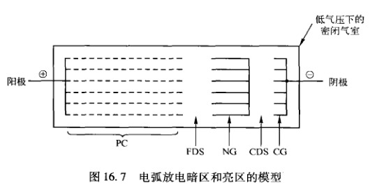 在CG區的外部邊緣,所有的電源適配器電子在向陽極運動的途中耗盡了它們的能量,從而速度降下來,這樣它們就沒有足夠的能量去激發那些中性原子達到更高的能態。在通過CDs區后,這些電子又重新被加速,在NG區的邊緣,它們又重新獲得能激發中性原子達到更高能態的能量,在通過NG區時因被激發的中性原子中的電子又重新返回初始軌道,而又會在NG區發出可見光。而游離的電子通過FDS區時,由于它們又耗盡了能量而無法再去激發那些中性原子達到更高的能態,因此又形成暗區。