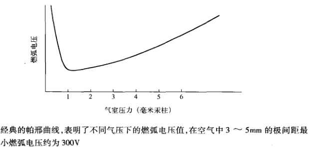 帕邢在1889年研究了在空氣中的一對電極之間,直流擊穿電壓和氣體壓力的函數關系。他采用的球形電極的直徑遠大于兩個電極之間的距離,這就避免了在尖端或邊緣附近產生很高的電壓梯度。他得出的結論,也就是著名的帕邢曲線,如圖16。6所示。當兩個電極之間相隔0。3~0。5cm時,在一個大氣壓下擊穿電壓接近于1000V。隨著氣壓的下降,擊穿電壓將會持續下降到300V左右的較低點,之后又迅速上升。其他氣體也表現出相同的特性,只是較低擊穿電壓點的臨界氣壓有所不同。