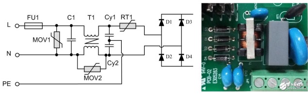 二、相關(guān)器件介紹 1.壓敏電阻 壓敏電阻的選型重要的幾個(gè)參數(shù)為:較大允許電壓、較大鉗位電壓、能承受的浪涌電流。 首先應(yīng)保證壓敏電阻較大允許電壓大于電源適配器輸出電壓的較大值;其次應(yīng)保證較大鉗位電壓不會(huì)超過(guò)后級(jí)電路所允許的較大浪涌電壓;較后應(yīng)保證流過(guò)壓敏電阻的浪涌電流不會(huì)超過(guò)其能承受的浪涌電流。 其他參數(shù)如額定功率、能承受的較大能量脈沖等,通過(guò)簡(jiǎn)單驗(yàn)算或?qū)嶒?yàn)即可確定。 2.Y電容 在進(jìn)行共模浪涌測(cè)試時(shí),若考慮成本等因素,在共模路徑中未加入壓敏電阻或其他用于鉗位電壓的器件時(shí),應(yīng)保證Y電容耐壓高于測(cè)試電壓。 3.輸入整流二極管 假設(shè)浪涌電壓經(jīng)壓敏電阻鉗位后,較大鉗位電壓大于輸入整流二極管能承受的較大反向電壓,則二極管可能會(huì)被損壞。因此應(yīng)選擇反向耐壓大于壓敏電阻較大鉗位電壓的二極管作為輸入整流二極管。 4.共模電感 理論上共模電感僅在共模路徑中起作用,但是因?yàn)楣材k姼袃蓚€(gè)繞組并非完全耦合,未耦合部分將在差模路徑中作為差模電感,影響EMC特性。 三、實(shí)例分析 背景:以某型號(hào)的電源適配器模塊為例,該模塊是周立功致遠(yuǎn)電子為某客戶(hù)定制的電源適配器模塊,輸入85VAC~350VAC,且EMC前級(jí)電路電路嵌入到模塊中??估擞恳蟛钅k妷?KV,共模電壓6KV。更換更大的保險(xiǎn)絲后可承受6KV差模電壓。其前級(jí)原理圖及對(duì)應(yīng)實(shí)物圖如圖2所示