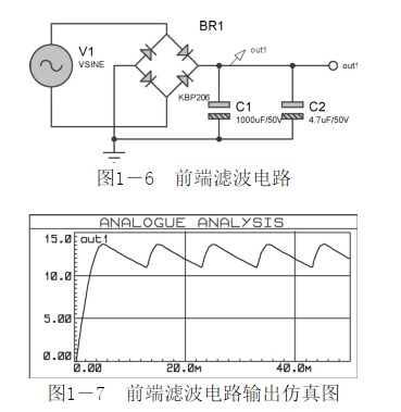 | 電容濾波一般負(fù)載電流較小,可以滿足放電時(shí)間常數(shù)較大的條件,所以輸出電壓波形的放電段比較平緩,紋波較小,輸出脈動(dòng)系數(shù)S小,輸出平均電壓UO大,具有較好的濾波特性。把電容器和負(fù)載并聯(lián),正半 周時(shí)電容被充電,負(fù)半周時(shí)電容放電,就可使負(fù)載上得到平滑的直流電。電路在三端穩(wěn)壓器的輸入端接入電解電容C1=1000μF,用于電源適配器濾波,其后并入電解電容C2=4.7μF用于進(jìn)一步濾波。在三端穩(wěn)壓器輸 出端接入電解電容C3=4.7μF用于減小電壓紋波,而并入陶瓷電容C4=100nF用于改善負(fù)載的瞬態(tài)響應(yīng)并抑制高頻干擾(陶瓷小電容電感效應(yīng)很小,可以忽略,而電解電容因?yàn)殡姼行?yīng)在高頻段比較明顯,所以 不能抑制高頻干擾)。濾波電路如圖所示。