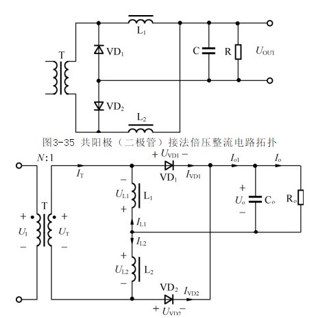 | 開關(guān)整流電路是電源適配器設(shè)計(jì)過程中重要的部分,它的技術(shù)是否關(guān)系著電源適配器系統(tǒng)的功能和可靠性。因此,一些電源適配器廠家很注重開關(guān)整流電路技術(shù)性能的改進(jìn),其目的是使開關(guān)整流電路的可靠性和效率得到很大提高,降低電源適配器成本和高頻電磁干擾。 倍流整流電路 倍流整流電路在適配器中得到應(yīng)用,可以提高大電流輸出時(shí)副邊整流電路的效率。常用的倍流整流電路拓?fù)淙鐖D3-34所示。與傳統(tǒng)的變壓器副邊帶中心抽頭的全波整流電路相比,倍流整流電路有以下優(yōu)點(diǎn):減小了變壓器副邊繞組的電流有效值;變壓器利用率較高,無需中心抽頭,結(jié)構(gòu)簡單;輸出電感紋波電流抵消,可以減小輸出電壓紋波;雙電感也更適合于分布式功率耗散的要求。