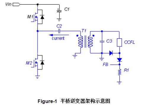 小尺寸CCFL(22寸以下)逆變器方案中,由于半橋架構設計簡單,成本低,應用非常廣泛,通常使用一個P+N的場效應管即可實現,其工作模式比較簡單。