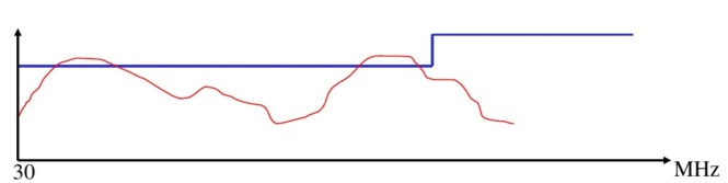 寬帶噪聲抑制方法 譜線問題描述: 30~300MHz頻段內出現寬帶噪聲超標, 如下圖: