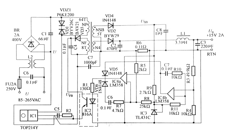IC4a的同相輸入端接電流檢測信號(hào)UR6,反相輸入端接分壓器電壓Ufy?分壓器是由R5?R8和TL431C構(gòu)成的?IC4a在將UB6與UFy進(jìn)行比較之后,輸出誤差。信號(hào)U,再通過VD5和R1變成電流信號(hào),流入光耦中的LED,進(jìn)而控制TOP214Y的占空比,使電源的輸出電流Io在恒流區(qū)內(nèi)維持恒定?顯然,VD5和VD6就相當(dāng)于一個(gè)“或門”?
