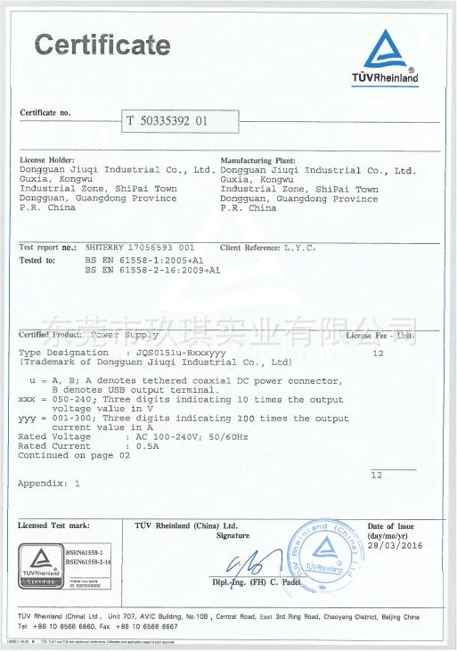 產品系列 15W插墻式電源適配器 產品型號 JQS0151U-ZXXXYYYY